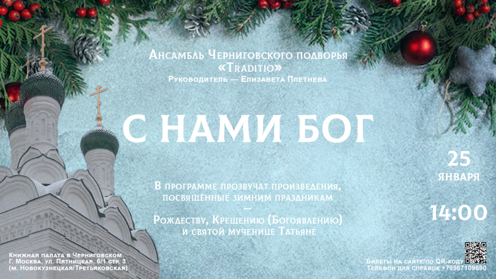 Приглашаем вас окунуться в светлую атмосферу зимних праздников на концерте духовной музыки «С нами Бог». Ансамбль Черниговского подворья «Traditio» представит программу, посвященную зимним праздникам — Рождеству Христову, Крещению и почитанию святой мученицы Татьяны.