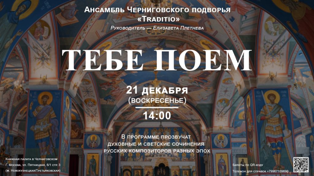 21 декабря, в воскресенье, в 14:00, в Книжной палате в Черниговском состоится концерт ансамбля Черниговского подворья «TRADITIO», под руководством Елизаветы Плетневой